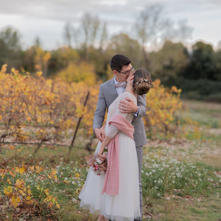 Tout l'enjeu du mois de novembre réside dans la lumière : les journées sont très courtes, il faut donc profiter au maximum de la lumière naturelle tant que nous l'avons. C'est ainsi que nous avons tout enchaîné le plus efficacement possible : sortie de mairie à 16h30, photos de groupe, et photos de couple dans les vignes à la tombée du jour, pile à temps ♡